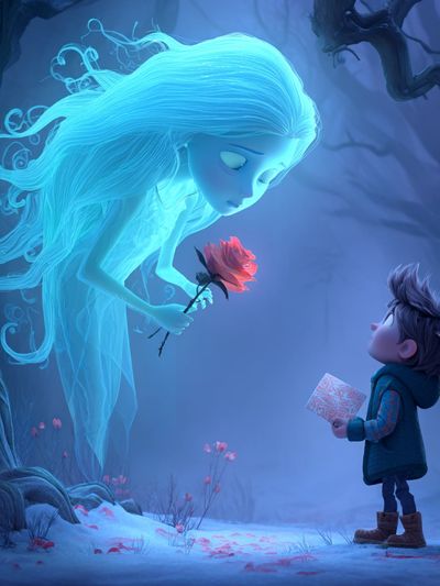 Near the oak tree, a ghostly woman hovered above the frozen ground. Her silver hair floated around her face like a cape. In her hands was a wilted rose, its petals faded and tired.